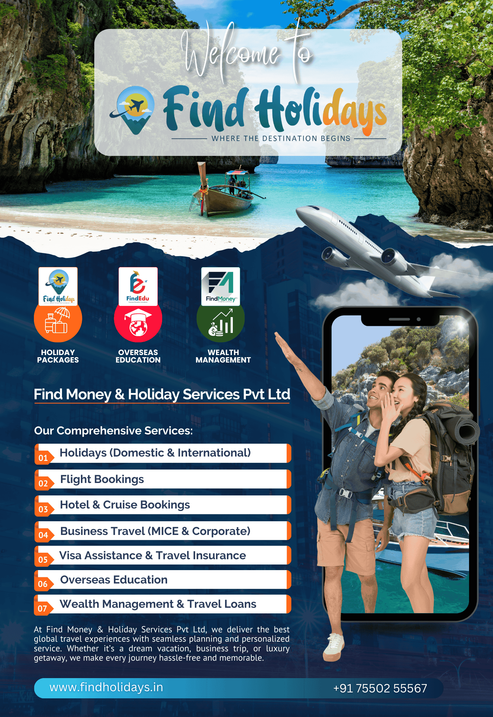 At Find Holidays, based in Chennai, we specialize in curating unforgettable experiences, making your travel dreams a reality. Our extensive services include Holidays, Flights, Business Travel, M.I.C.E, Visa Assistance, Hotels & Cruises, Event Management, Travel Loans, Travel Insurance, Wealth Management and Overseas Education.